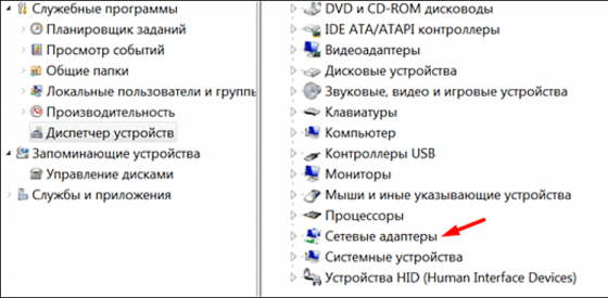 • Откроется дерево каталогов, разделенное на группы по назначению. Выбираем раздел «Сетевые адаптеры».